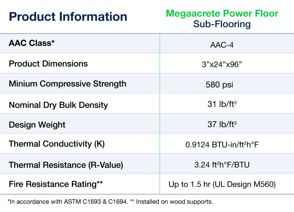 Megaacrete Power Floor significantly enhances durability, offering occupants a more solid and quieter experience compared to traditional wood decking. Manufactured from Autoclaved Aerated Concrete (AAC), it combines lightweight construction with high strength and excellent thermal and acoustic insulation. This innovative system delivers superior performance at a fraction of the cost of other precast or cast-in-place concrete floor systems, making it an ideal solution for both residential and commercial applications.